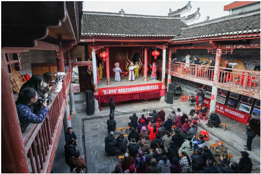 Photos show cultural workers giving performances in Leigongjing Ancient Village of Jiahe County, Chenzhou City.