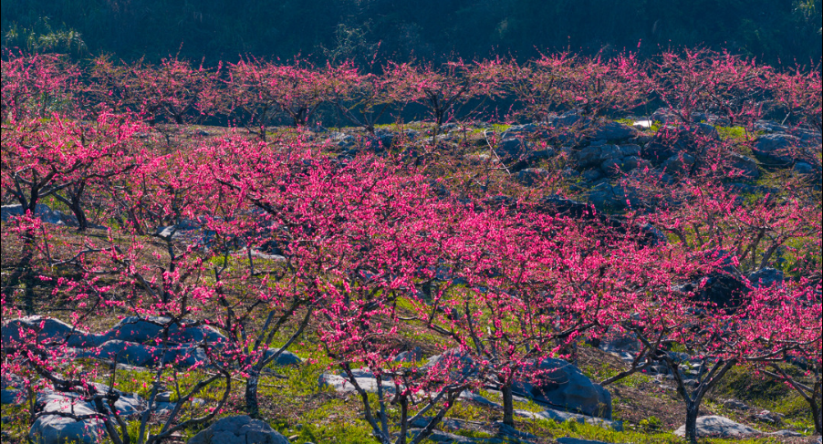Over 2,000 mu (133.33 hectares) of peach trees are now in full bloom in the rocky desertified area of Caotian Village.
