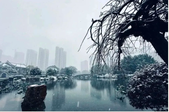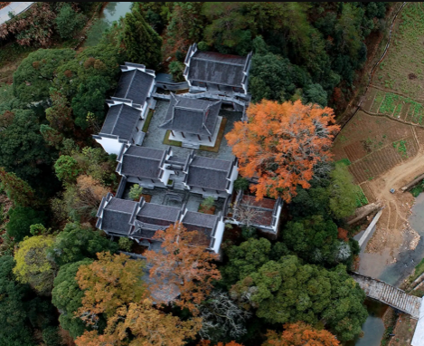 The antique Sijing Academy is perfectly integrated with the colorful trees, adding charm to the countryside in winter.