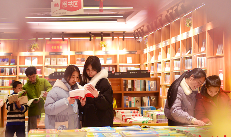 Photos taken on February 19 show citizens reading books at the Xinhua Bookstore in Jiahe County, Chenzhou City.
