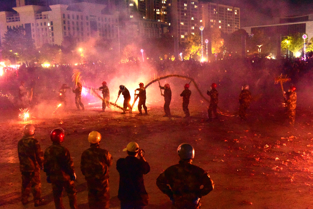 Burning incense dragon dance performed in Luyang town