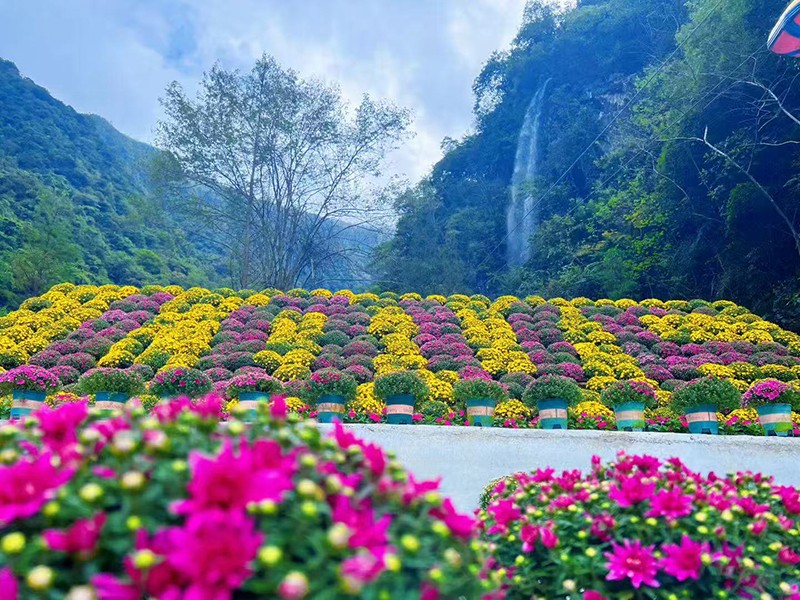 Dishuiyuan Scenic Area in Linwu County are adorned by thousands of pots of chrysanthemums.